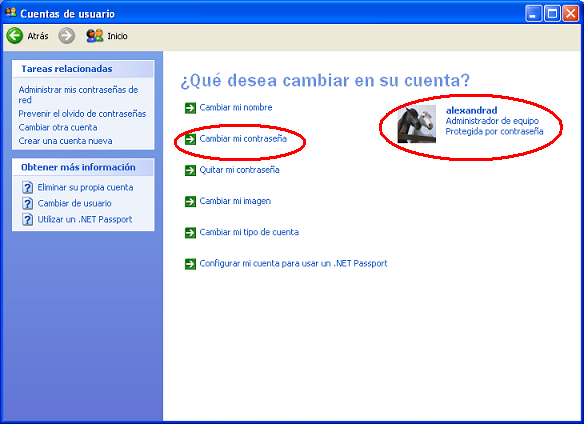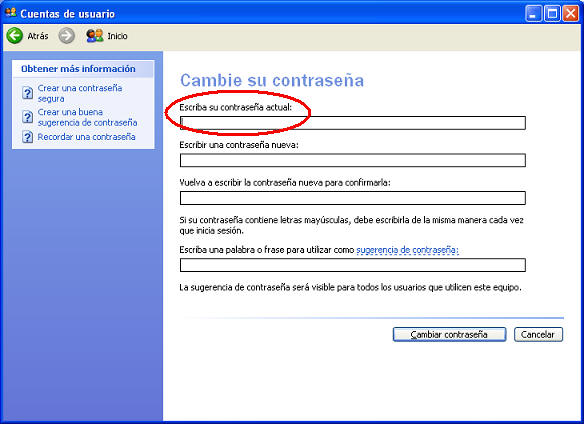 c) Se cambia la Contraseña del Equipo (Debemos digitar los mismos datos que aparecen en el Primer Procedimiento en la parte superior de esta página, es decir que en la casilla de Escriba su contraseña actual debe indicarse el mismo dato de la antigua clave que se tenia En el Ejemplo sería ( Ej: pepito88 ), esto no quiere decir que el anterior procedimiento no se aplico, solamente que tenemos que hacer un paso adicional, en esta ocasión para cambiar la contraseña del Usuario del Equipo y no de la Red.